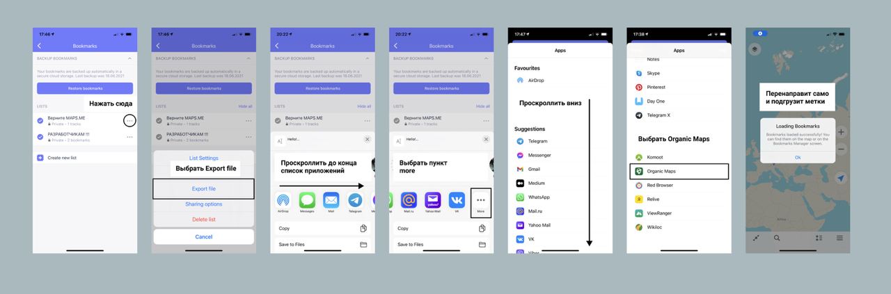 To import bookmarks from MapsMe and other apps which support KML/KMZ on Android, open Bookmarks menu from the bottom toolbar and press Import button.